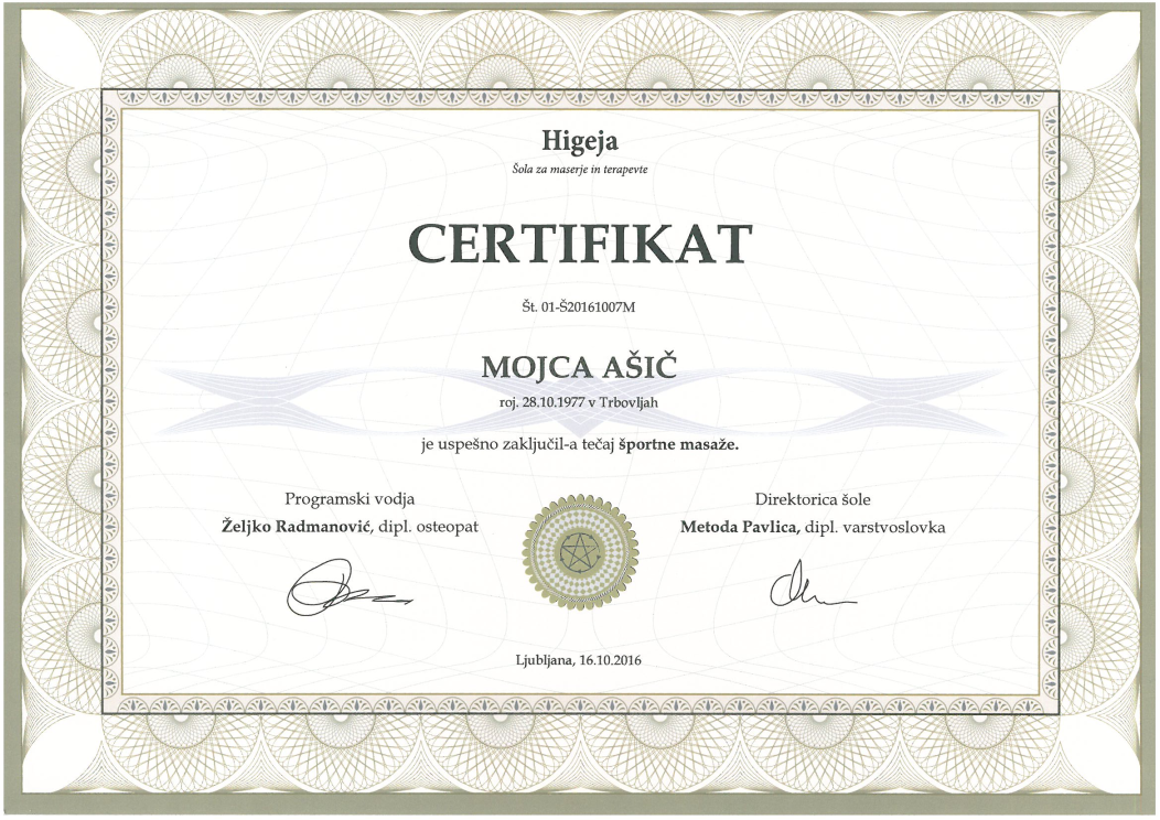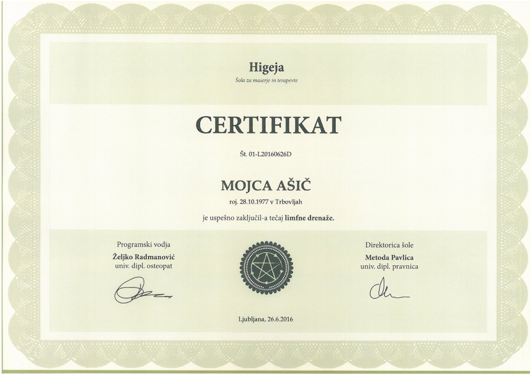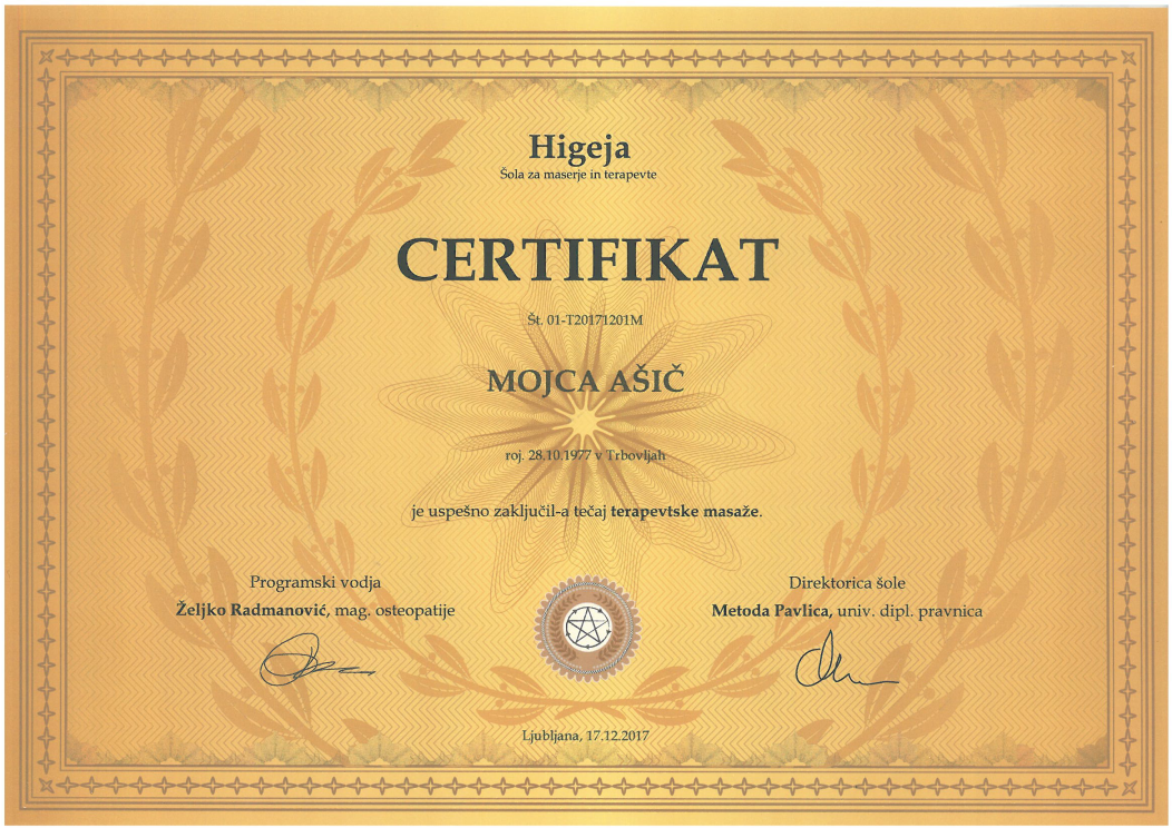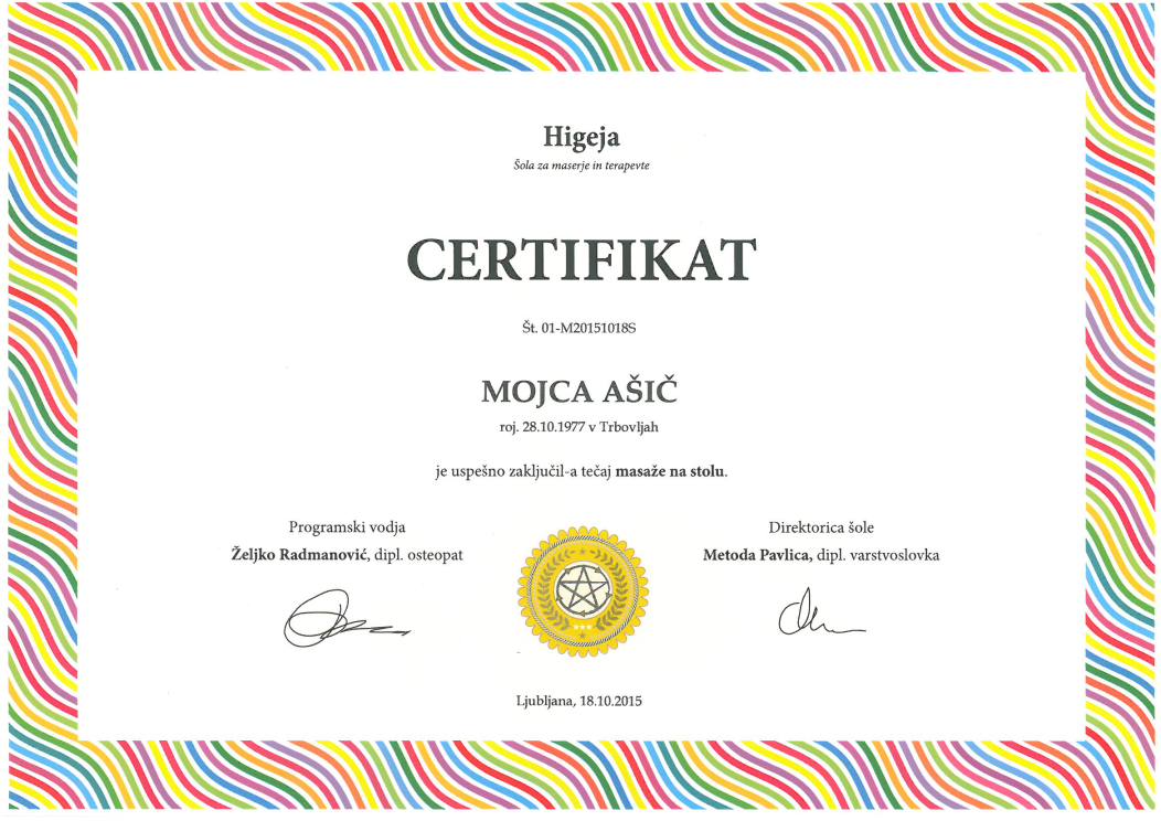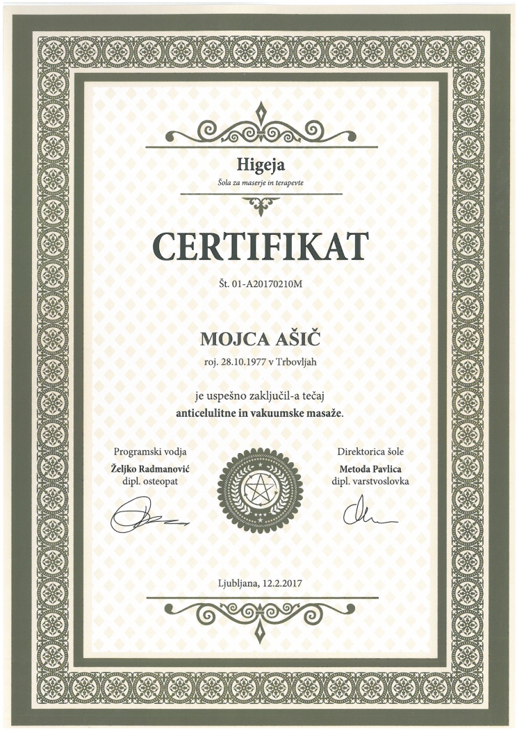 Sem Mojca, vaša pedikerka in maserka. Znanje sem pridobivala na srednji kozmetični šoli v Ljubljani, dopolnjevala in nadgrajevala pa sem ga z udeležbo in aktivnim sodelovanjem na številnih dodatnih izobraževanjih in seminarjih.